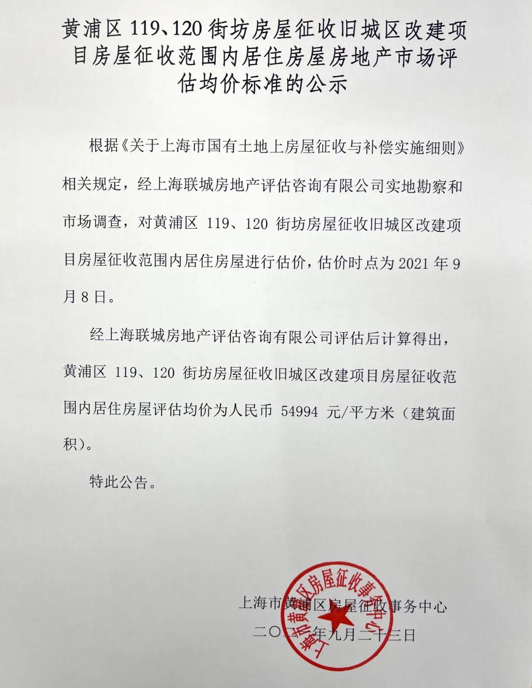 根据《关于上海市国有土地上房屋征收与补偿实施细则》的相关规定,经上海联城房地产评估咨询有限公司评估后计算得出,黄浦区119、120街坊房屋征收旧城区改建项目房屋征收范围内居住房屋的评估均价为:54994元/平方米(建筑面积)。