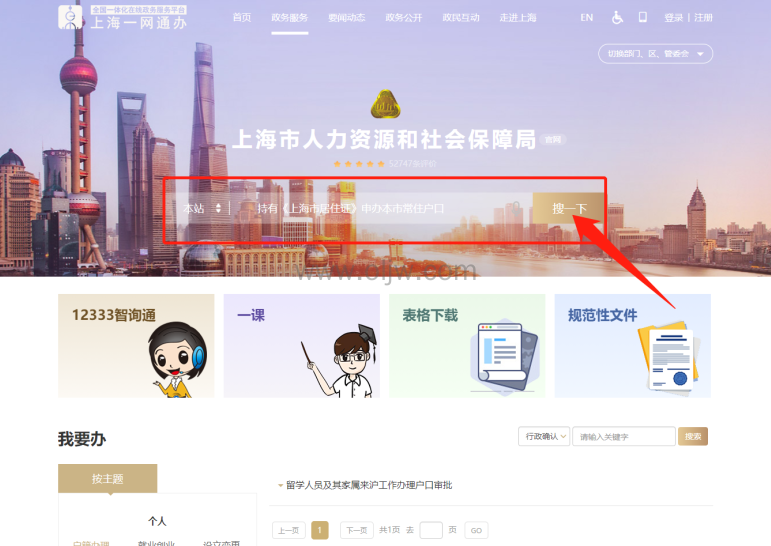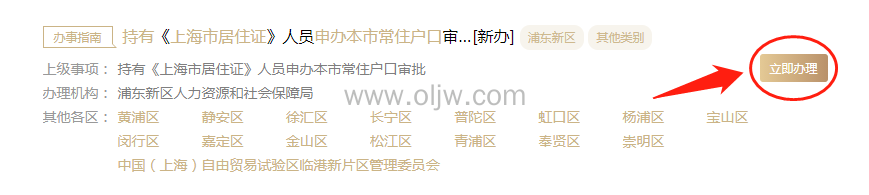 登陆上海市人力资源和社会保障网,进入"一网通办",搜索"持有《上海市居住证》申办本市常住户口",点击立即办理。