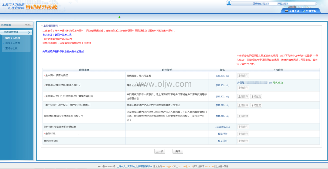 申请信息填写完成后,系统会自动形成上传附件清单。