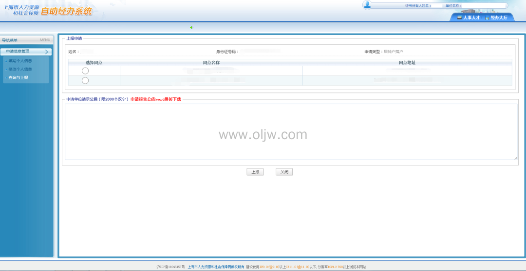 附件上传完成后点击上报,然后选择申报网点,并严格按照系统样张填写好《申请单位请示公函》,最后点击“上报”,到此居转户的信息填报工作就完成了!