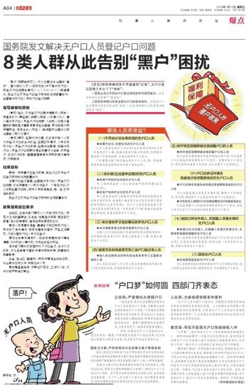 按照党中央、国务院决策部署,全国公安机关积极会同有关部门,结合开展第六次全国人口普查户口整顿、集中换发第二代居民身份证、深入开展户口登记管理清理整顿等工作,大力解决无户口人员落户问题,取得明显成效。