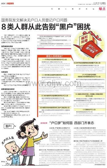 答:去年以来,公安部组织全国公安机关深入了解各类无户口人员基本情况,系统梳理各地户口登记政策,认真剖析造成无户口问题的原因,排查出不符合计划生育政策、未办理《出生医学证明》、未办理收养手续的事实收养等八个方面的主要原因。据此,《意见》分门别类,就上述无户口人员登记常住户口分别提出了具体政策措施。